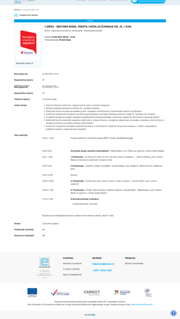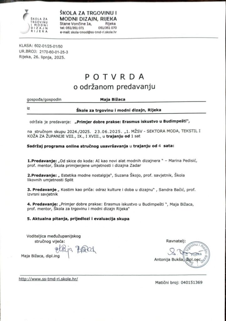 Potvrda o održanom predavanju o job shadowingu na Međužupanijskom stručnom skupu sektora Moda, Tekstil i koža – Maja Bižaca, prof